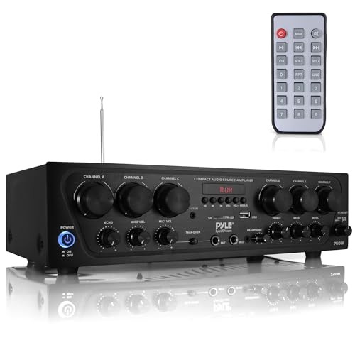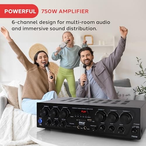 Pyle Wireless Bluetooth Karaoke Amplifier - 6 Channel 750W Power, Stereo Receiver Home Audio Amplifier w/USB,AUX, Subwoofer Out, Headphone, 2 Mic Input w/Echo, Talk-Over For PA