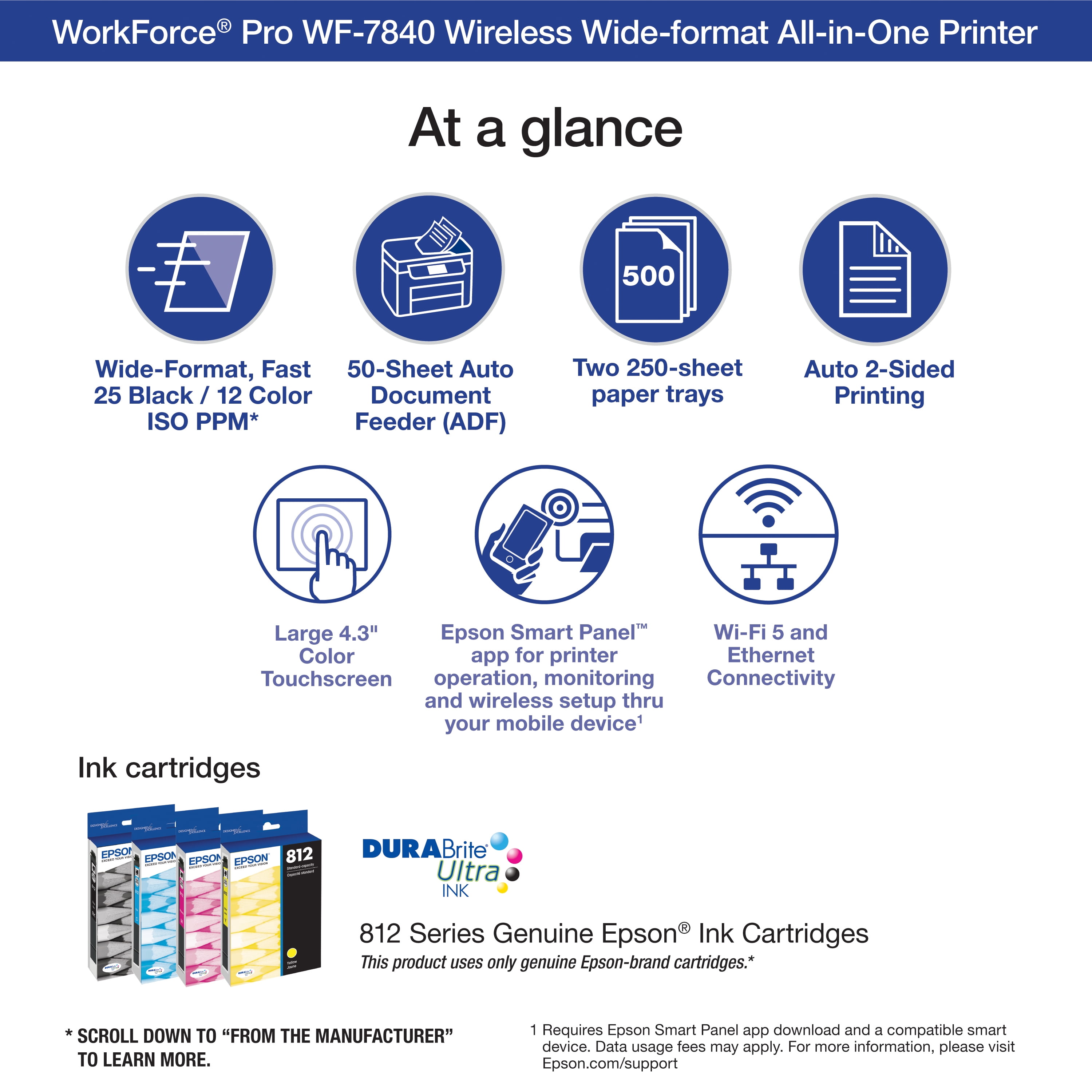 Epson Workforce Pro WF-7840 Wireless All-in-One Wide-Format Printer with Auto 2-Sided Print up to 13" x 19", Copy, Scan and Fax, 50-Page ADF, 500-Sheet Paper Capacity, and 4.3" Color Touchscreen