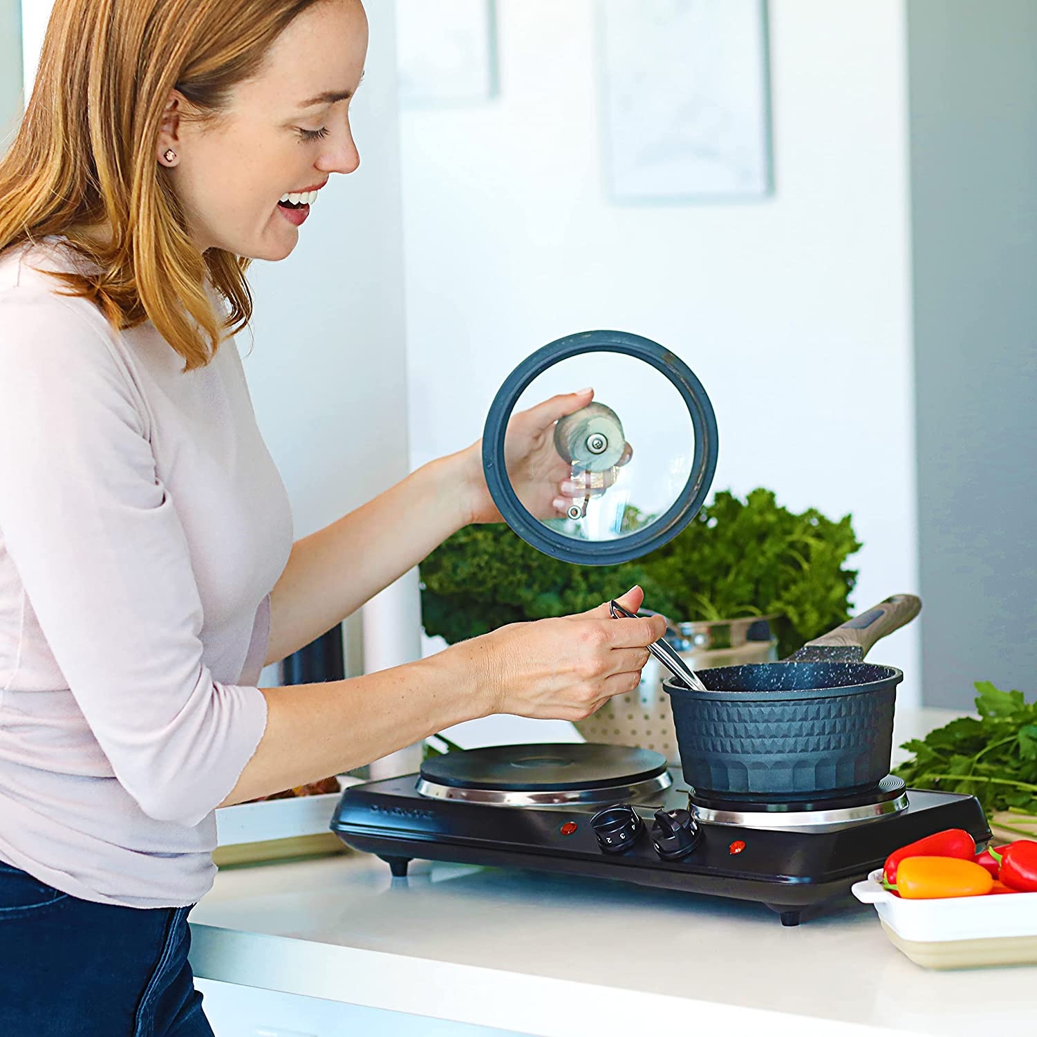 OVENTE Electric Countertop Double Burner, 1700W Cooktop with Cast Iron Hot Plates, Black BGS102B
