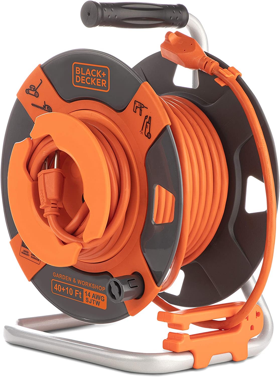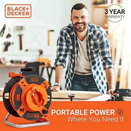 Black + Decker 50 Ft. Reverse Retractable Extension Cord Reel 14AWG SJTW Power Cable, For Electric Tools - Outdoor Power Cord Reel W/Heavy-Duty Rewind Handle - Premium Cord Retractor for Garden